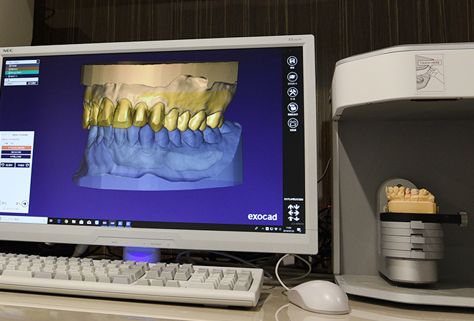 口腔内をスキャンすることで、より正確に口腔内の情報を読み取ります。そしてそのデータを技工士へ送信することができ、デジタル上で作成物の設計を行うことができます。